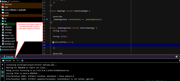 The yellow electric button seen in the above picture is the hot reload button. Hot Reload is a unique feature that allows the software to be modified in a shorter amount of time. In normal growth, you must wait a minute after clicking the green run button to update your app, but with hot reload, your app is updated in a fraction of a second.