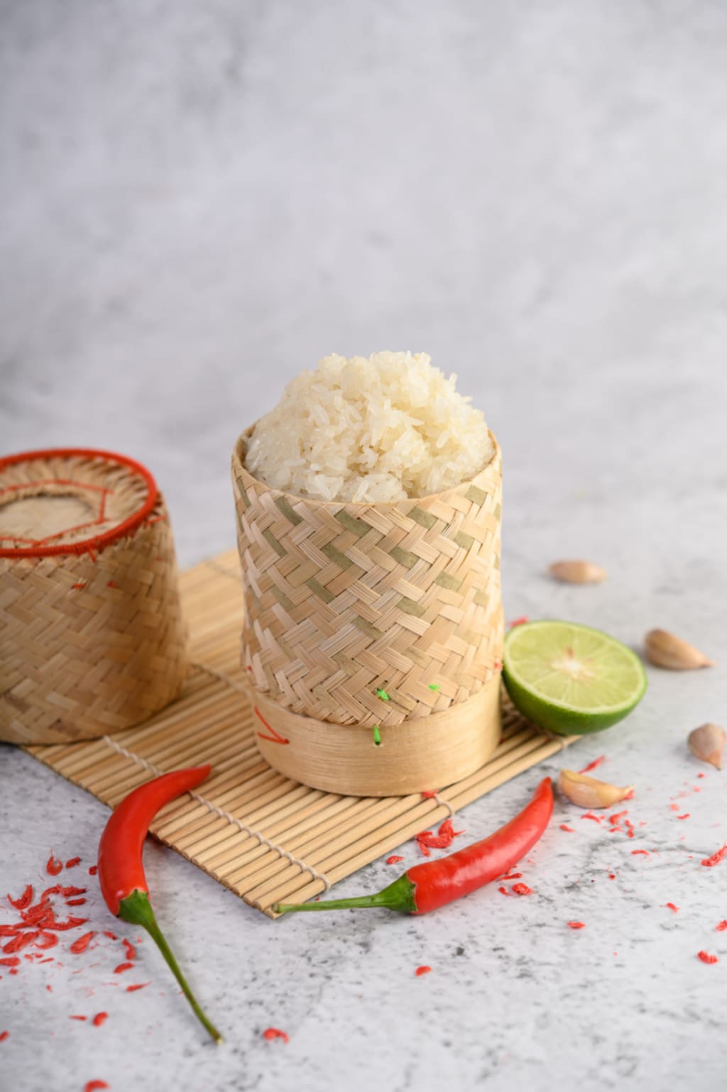 This option includes a sticky rice steamer basket that doubles as a serving basket. Once the rice is steamed, it can be placed into the basket with a lid to keep it warm and fresh. It's a traditional Laotian style, often seen in street food markets, and ideal for table presentation.