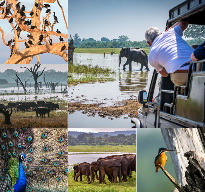 Udawalawe National Park is most famous for its large population of elephants, which can be seen in large herds throughout the park. The park is also home to many other species of mammals, including spotted deer, sambars, wild boars, water buffaloes, and leopards. Visitors to the park can also see many species of birds, including the Sri Lankan junglefowl, painted storks, and the endemic Sri Lanka grey hornbill. Reptiles and amphibians found in the park include crocodiles, snakes, and turtles.
