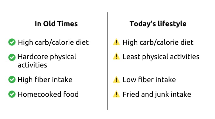 Yes, it is healthy, of course, but in earlier times, the day was filled with core physical activities for both men and women, hence their calorie intake used to completely get burned. They included no fried foods but high fiber content in their diets. Nowadays, the calorie and carb intake is the same, fried food has increased, fiber has significantly reduced, and at the same time, physical activities are close to 0. The carbs, not being burned, turn into glucose, which eventually raises issues.