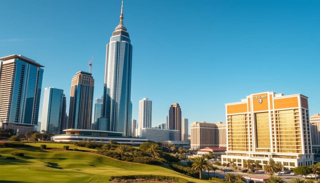 A luxurious skyline featuring Trump Tower, a golf course with elegant landscaping, a high-end hotel facade with a gold exterior, and a bustling real estate development scene in an urban setting, all under a bright blue sky.