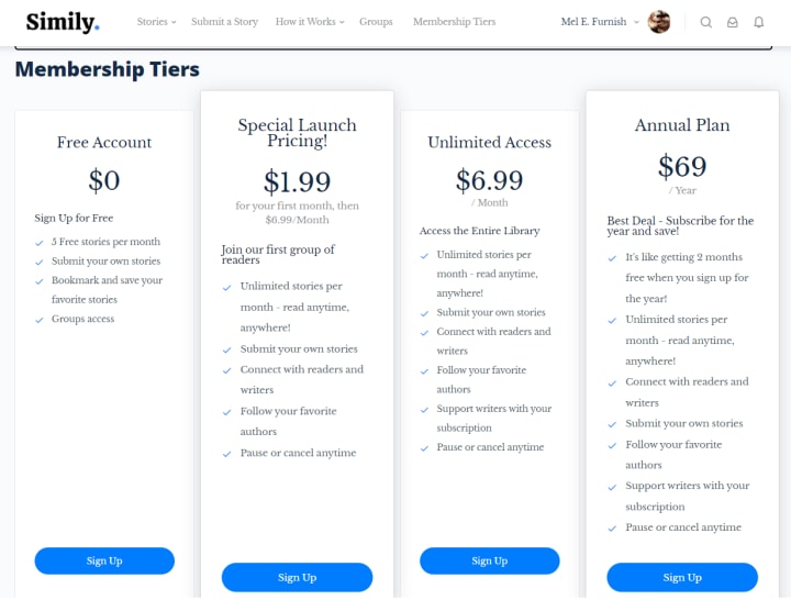 Simily offers a free plan where the visitor can get five free stories to read per month.