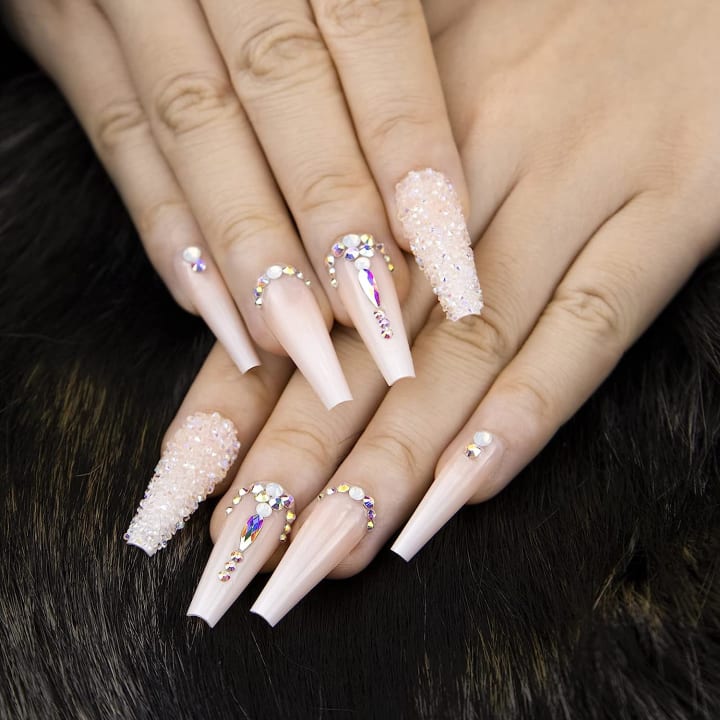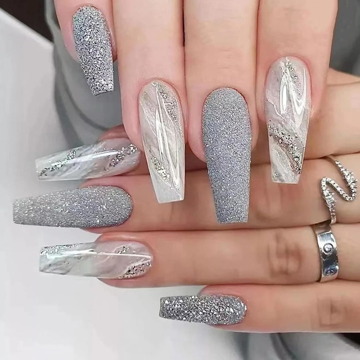 These nails have a fresh minty effect that is hard to resist. The sparkles mimic stars, while the overall design evokes a firework show against a white base. Whether you have short or long nails, this chic and stylish look is suitable for everyone.