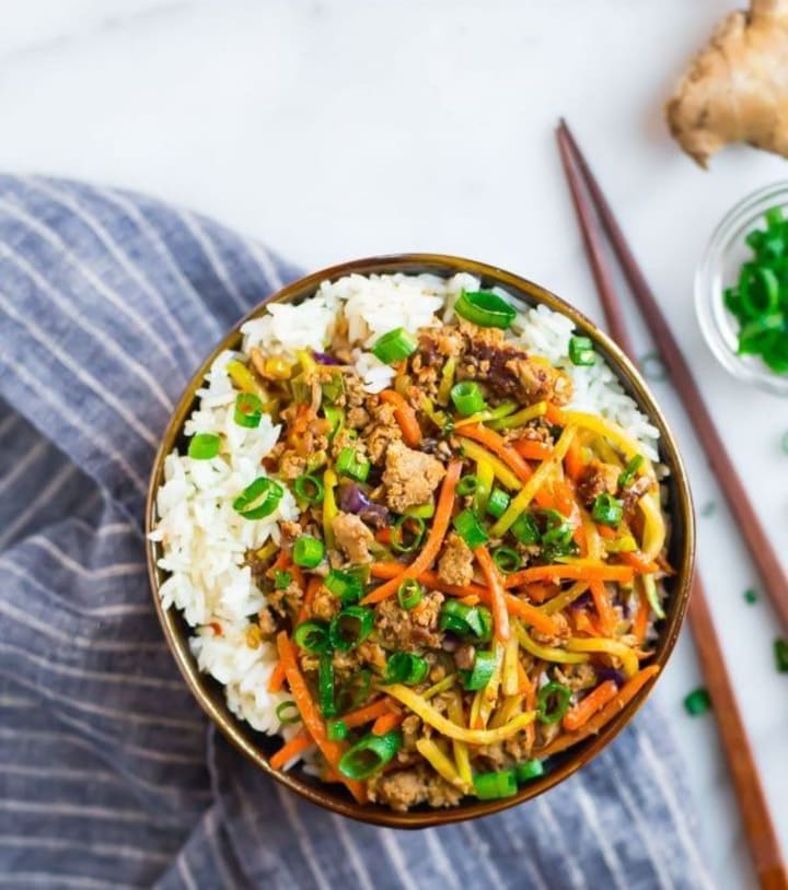 This recipe takes all the good fillings of a classic egg roll and puts them in a fresh and healthy bowl, featuring juicy meat or tofu, fresh ginger and garlic, soy sauce, and tons of thin strips of fresh veggies. It tastes phenomenal reheated too, trust.