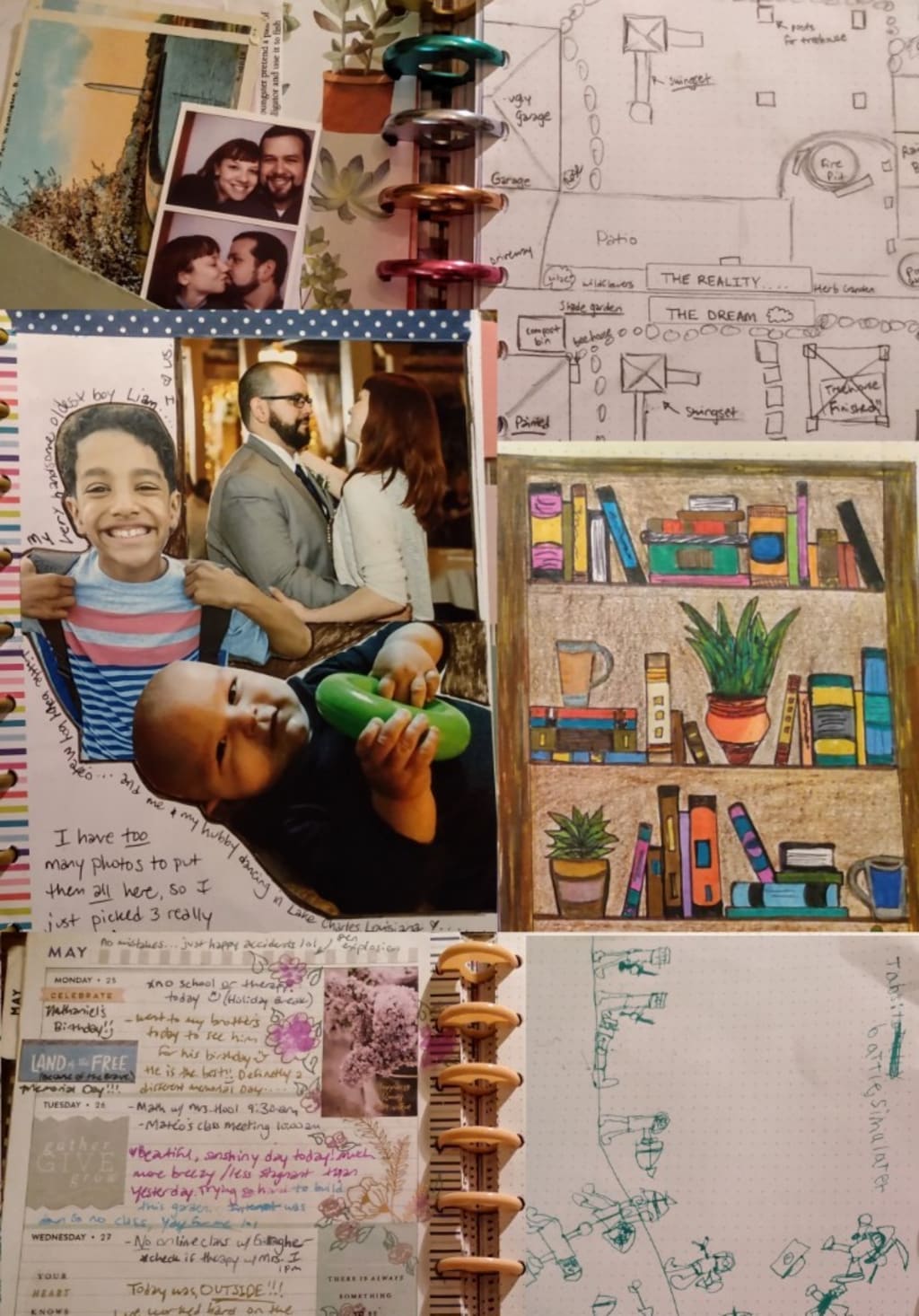 I started slow. I decorated the first few calendar pages with stickers and drawings. I added quotes, shopping lists, and paper clipped in pictures here and there. Soon, I was taking things to a whole new level. I took the kids' art projects, hole punched them, and added them to my planner. I took those collected photos and cards and started collaging them on the blank pages. My hopes and dreams were written down in detail. I started journaling again. I added more and more blank pages to meet the demand for space. I was drawing and coloring again, directly in my planner. If I found a recipe in a magazine or an old book, I cut it out and glued it, then decorated the page. Old ticket stubs, photo booth photos, menu art, maps from a trip... they all had a space now and that space was just beautiful! It brought together all of those unfinished projects in a way I never expected. I was even hesitant to call it art, at first. But, looking back on several years worth of my life in book form, I realized that art, like life, is truly what you create from it. My beautiful mess of art is a reflection of my beautiful mess of a life. And every page represents a moment, a person, a word, a day, that I want to cherish forever and now thankfully, I can....