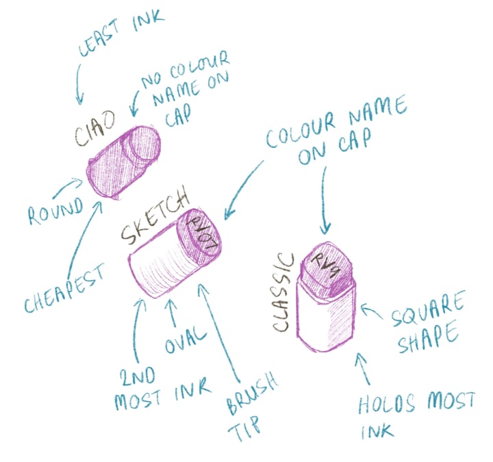 - Some brands (like Copic) make sure their colours are compatible across marker lines, so you can buy different sorts of marker bodies without having to worry about ink compatibility.