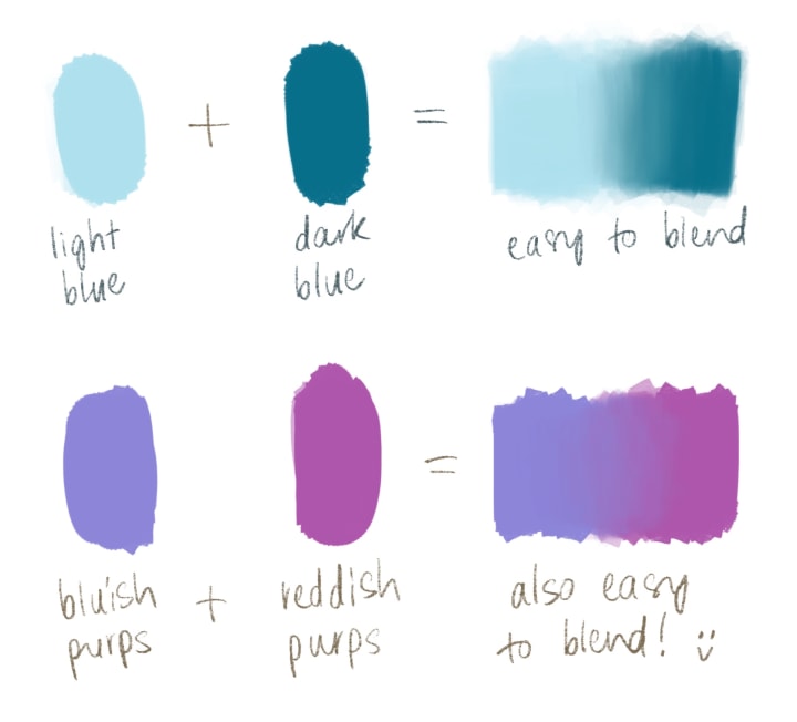 - In the same colour family (so blending a light blue with a dark blue, or a bluish purple with a reddish purple)