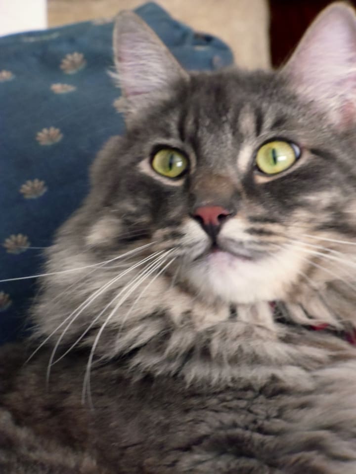 While waiting for his eyes to arrive from Spokane, WA, I worked on laying more of his fur, again, piece by piece, punching in bits, and trimming as needed. This is where he started to look like a real cat.