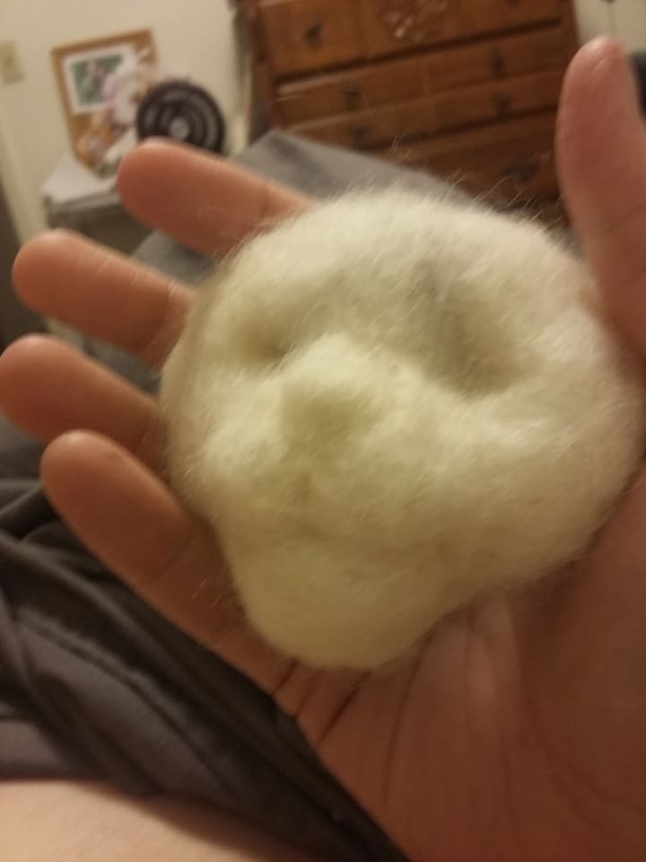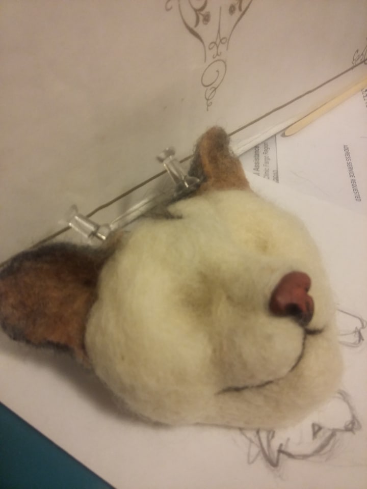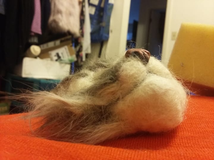 I started by using white sheep's wool, core roving to sculpt his face. Since I'm disabled, a lot of this was done in my bed, where I do most of my artwork. Needle felting is a craft done by poking a barbed needled into wool repeatedly, which can create some really great and detailed sculptures. It is really relaxing to zone out and stab away, knowing that something spectacular is going to be created when you are done.