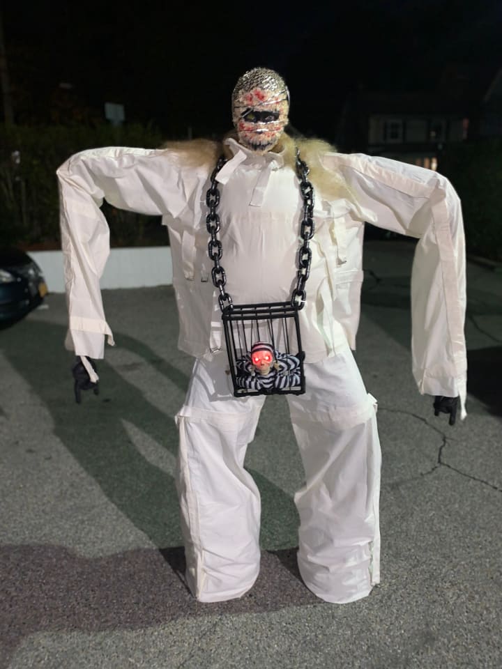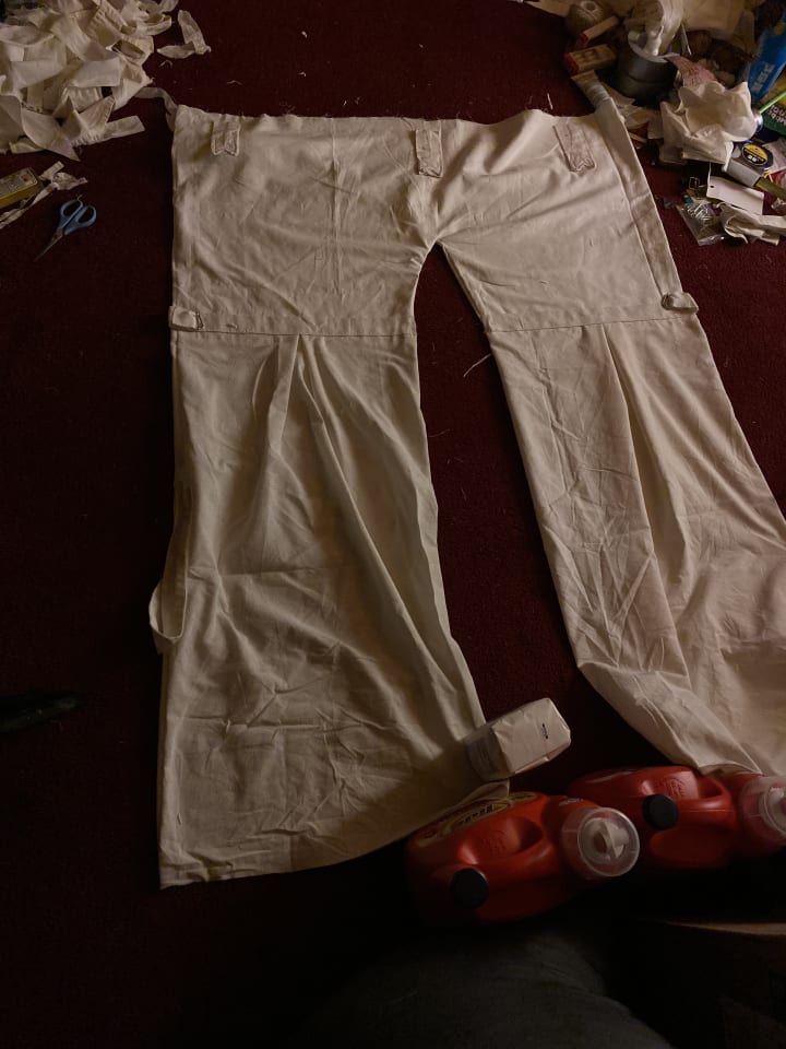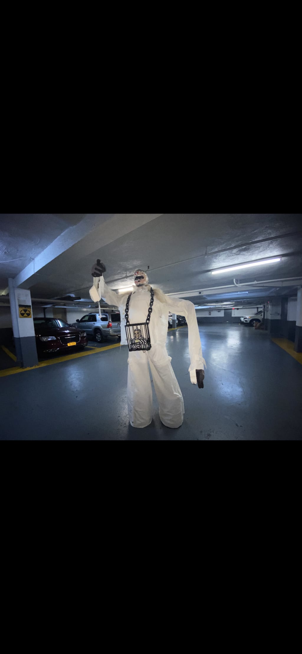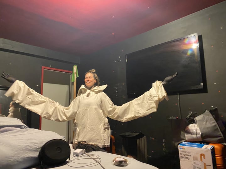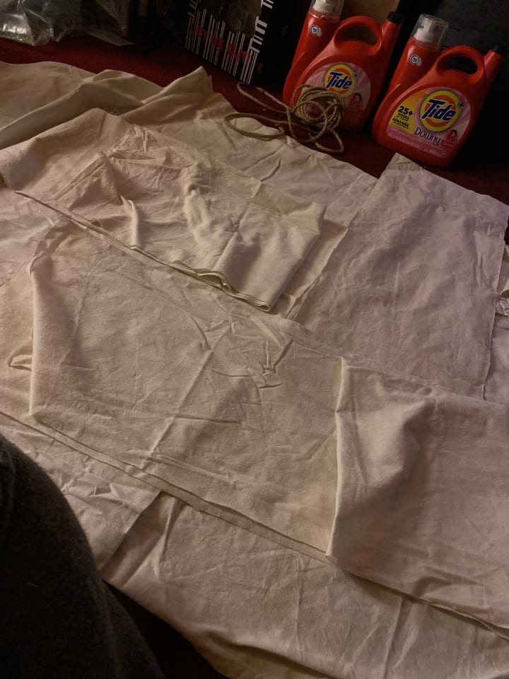 Made from a curtain, two buckets, two trash grabbers, tacks and fake fingernails...
