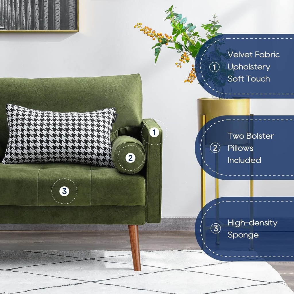 In conclusion, the Vonanda Velvet Sofa Couch captures the spirit of mid-century craftsmanship with its elegant mustard green velvet upholstery, tufted back cushions, and thoughtful bolster pillows. Balancing style, comfort, and practicality, this 73-inch 3-seater sofa is a testament to how classic design can seamlessly integrate into contemporary living, creating a harmonious oasis that celebrates both form and function.