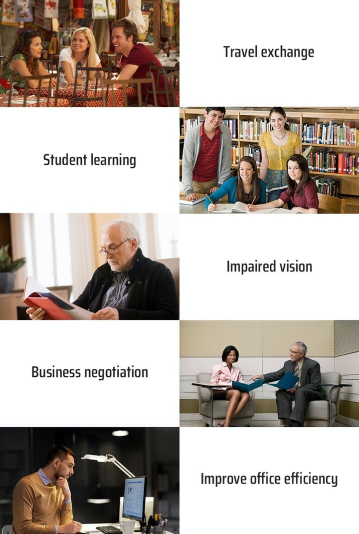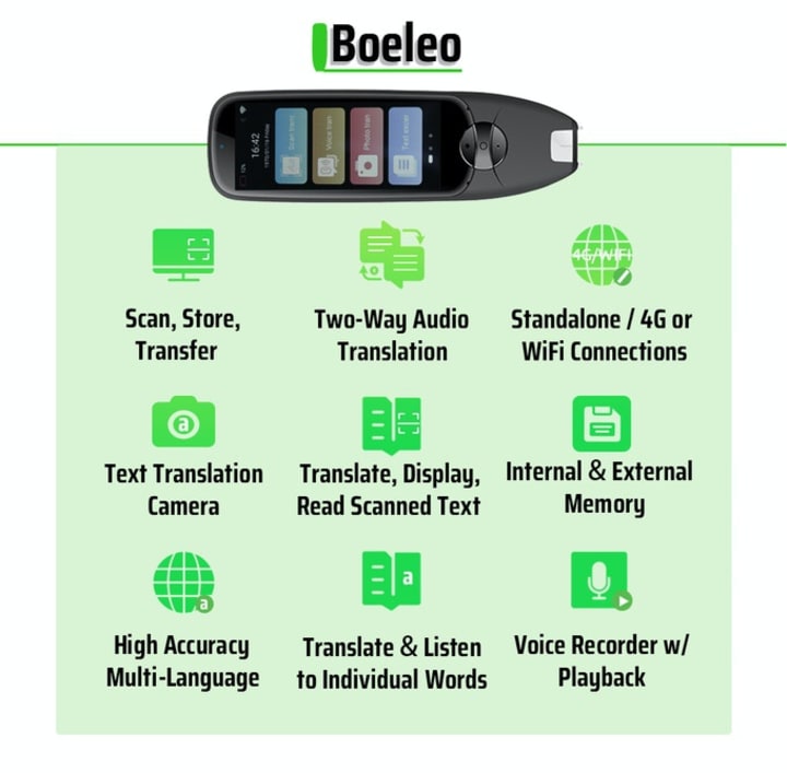 Boeleo covers 116 dialects in online mode. When associated with the web by means of WIFI or 4G cell (viable with 200 nations' SIM cards), Boeleo requires only seconds to decipher and peruse resoundingly, guaranteeing Zero Barrier correspondence at work, in gatherings, or while voyaging. With Boeleo, you can be a "multilingual speaker."