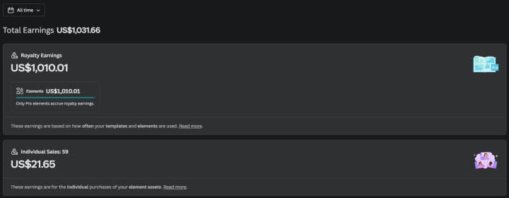 But here's the real reason you should care about Canva: They have a contributor/creator program that lets users like you and me upload our own designs and templates for others to use on the platform. And if one of your designs gets purchased, you get a cut of the sale. Cha-ching!