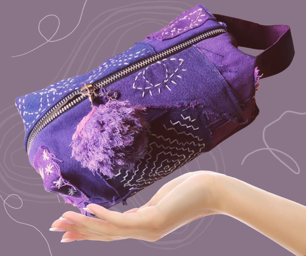 I add the zipper, the lining, “box” (sew and cut) the corners to shape the bag and turn this beauty right side out so I can meet it for the first time. I add a purple leather strap, make a cotton pom pom dyed to match, and clip a small silver sun and moon charm to the zipper pull beside the pom pom. The finished bag is nearly a twin of the watercolor sketch I made at the outset of the project. Time, love, and sewing skills have transformed three pairs of guilty jeans into a new, beautiful, useful bag that now makes me smile when I see it. It’s ready to make new history.