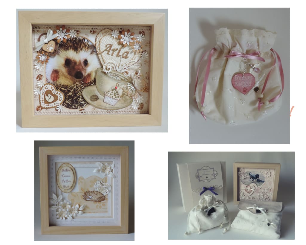 Arla was a miniature hedgehog who’s home was decorated in the style of a coffee shop so I designed a background for the front of the frame with coffee beans. I hand cut a coffee bean shape in paper as a template, with scissors. (with ‘paper’ scissors mind, not fabric ones, read on and you’ll understand my thought here) The coffee bean shape was then hand cut from foam, this was used to make a stamp for the coffee bean background. I also hand cut a coffee bean and other elements like the coffee cup and saucer which were layered in a 3D style to help give a sense of Arla’s coffee shop styled home. I felt I had really captured a memory of this very much loved little hedgehog. I love designing the frames, I use different tools to form flowers and flourishes. I also have hand tools to help transform the elements to get the best out of them as they are mostly made from a flat piece of card. While designing my frames I am able to apply many types of crafting techniques, using various materials and mediums and these projects give me what I need to satisfy my need to dabble into many a crafty area.