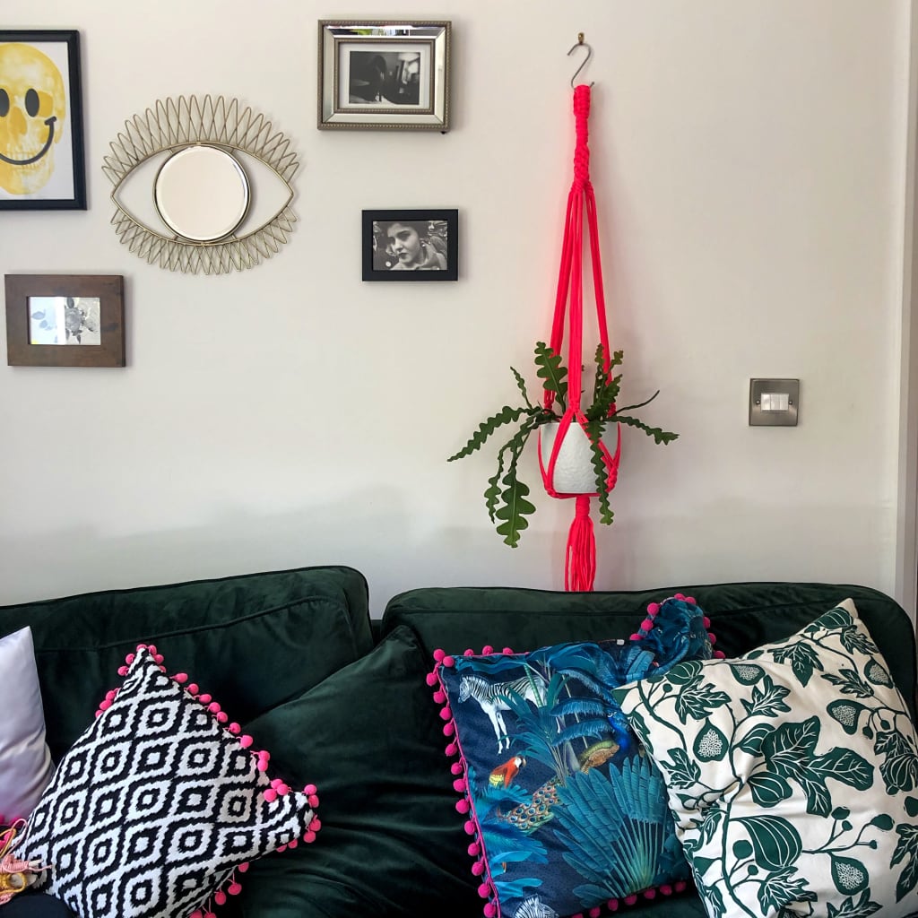 I have always wanted to learn macrame, but never really had the opportunity as time was valuable, and with two jobs and a photography background, it never happened. That was until I got ill. I wont go into the details, but what I can say is I was bedridden, for over 12 weeks. In that time my boredom quickly evolved from watching movies, to feeling like I really needed to do something. Macrame! the perfect thing to keep me and my hands occupied. I learnt by watching several youtube videos and got to knotting. I experimented with knots and different types of thread, and literally covered the house in hangers. My friends loved them, including one particular stylish friend. I knew I had to find the perfect neon pink for him and was super happy to find some reclaimed jersey in a local craft shop- Perfect!