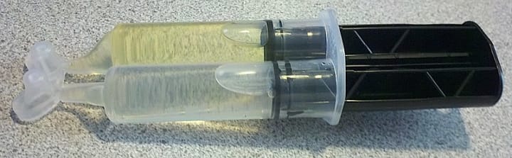 A syringe of "5-minute" epoxy glue, containing separate compartments for the epoxy resin and the hardener
