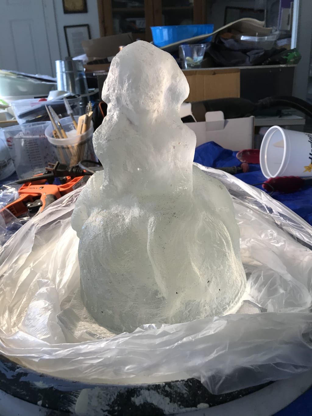 At first glance, it seems that this 10” high, 7” wide, 18 pound cast glass sculpture couldn’t have required scissors during creation, but it did. This is a work in process that is in the middle of the polishing sequence which will take another 4 to 6 hours to complete. It is entitled “Three” and has three abstracted human figures joined in the same structure. After numerous drawings, I settled on one design and began sculpting. This piece started life as a water-based clay sculpture. While the clay was still wet, an investment mold made from Randolph R&R 910 mold mix was applied in layers over the sculpture to a mold width of approximately 2.5” around the whole sculpture except for the top. The top of the sculpture was treated with a wider mold mix application and flattened with a piece of leveled glass. The sculpture top becomes the bottom when the dried mold is placed in the kiln when ready to receive melted glass.