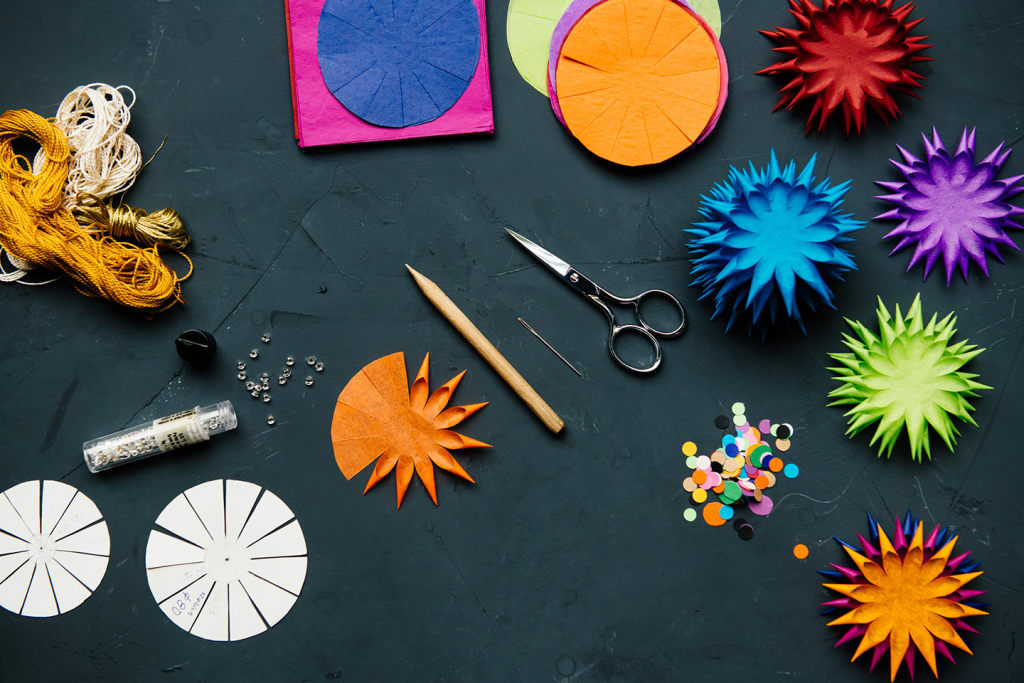 I hadn’t really paid much attention to an innocuous little activity my grandpa would do until I was a teenager. For years throughout my childhood when I visited him, I would watch him take out his tissue paper, scissors, glue stick, thread, needle, and a little stick in the exact shape of a pencil, just one without lead, that he had whittled down himself. He’d cut palm-sized circles out of the tissue paper, with slits from the outside nearly to the center, then he would spend hours rolling little points from the cut tissue paper. Each disc turned into a beautiful little “star” and as soon as he had about 12 of these, he’d string them all together, pull the string tight, and it would turn into a spikey ball. He called these little balls “jeżyki” in Polish, which translates to “little hedgehogs” in English.