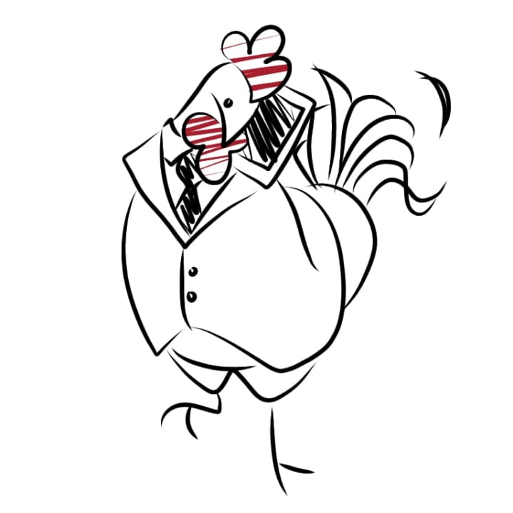 2. Kaksi, pronounced "cock-see". This one was a little bit easier to imagine, as my brain immediately came up with an image of a rooster; aka- a "cock". But a rooster isn't memorable enough, so I put him in a business suit and gave him a cell phone. This helps because you're often more likely to remember something silly than something normal.