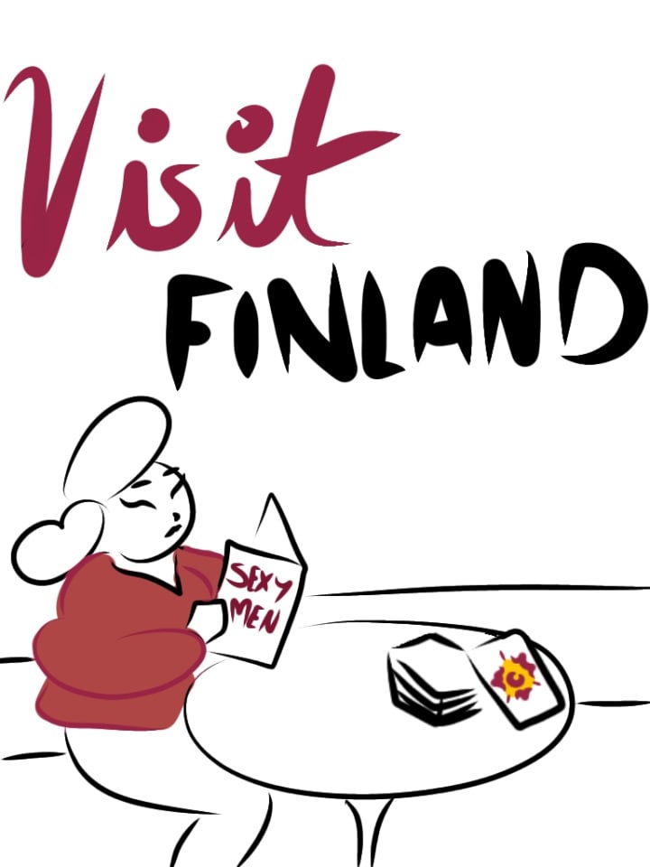 On the wall behind her, there's a poster that reads "Visit Finland". On the poster is a woman in a cozy-looking red sweater sitting at a table. From the table, she picks up a magazine titled "Sexy Men" and begins to read.
