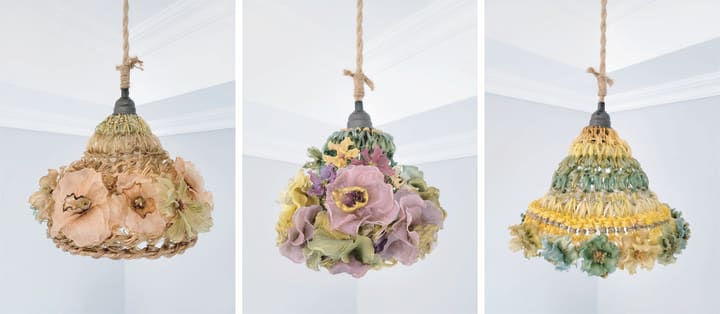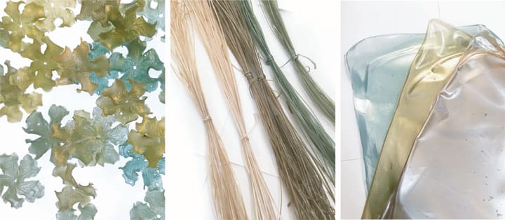Agar is a high-strength gel mainly extracted from two types of red seaweed. It is usually sold in powder form, then reconstituted with water into a shapeable substance through boiling, cooling and dehydrating. With assorted molds, various textures and forms could be carried out in making agar units, including petal units in different multiples, and pistil units in a rich cluster. Agar sheets could be made from diverse flat surfaces. The sheets look extremely like plastic films. It is shiny and stiff. I use various floral shape pattern punches to create smaller components. Lastly, I make handcrafted agar yarns which serve as “threads” to connect all components together to form a lively agar flower. I also knit agar yarns into textiles as the foundation of lamp shapes which could be further attached with agar flowers.