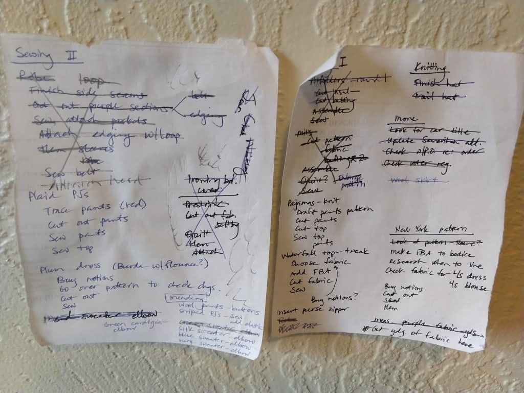 The last subtasking secret is that I sometimes also stick sewing lists to the wall behind my machine. I don’t do that with every list, but one of the rare business books I read, The 4 Disciplines of Execution, talks a lot about the importance of visual reminders.