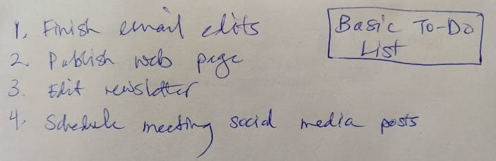 At this point, maybe you’re thinking, “But isn’t this just making a list?” Yes and no. Until I learned to subtask, my lists revolved around distinct projects. For example, a work to-do list might have looked like the following.