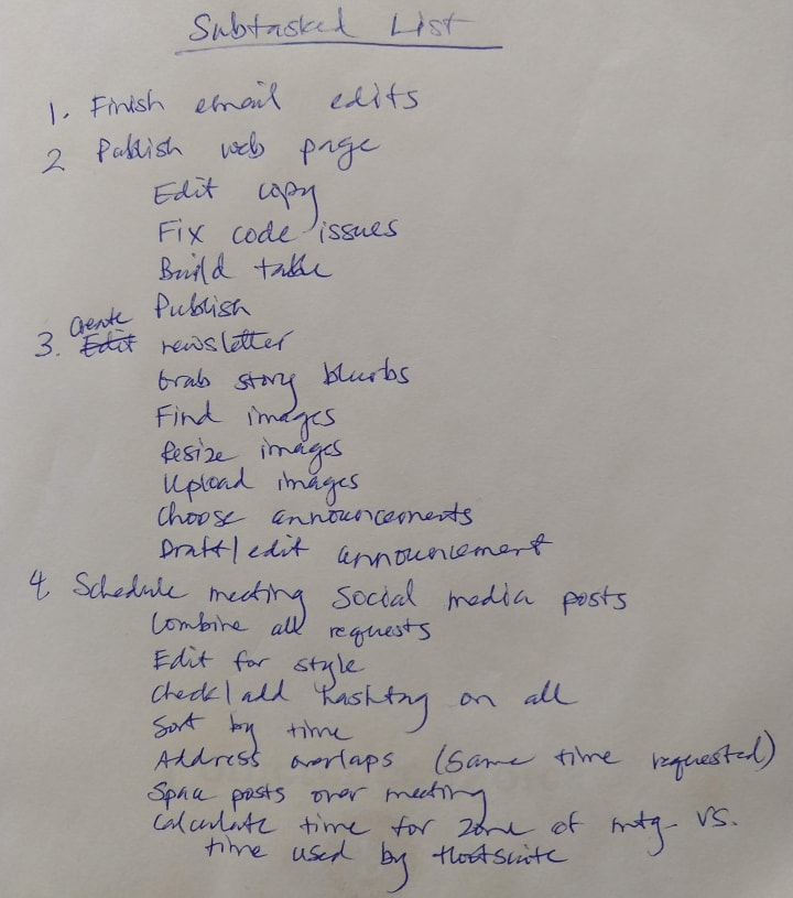 But when I ran into trouble, it often involved the fact that some of those simple-sounding tasks entailed a mini-project. Here's what a subtasked version of that list might look like.