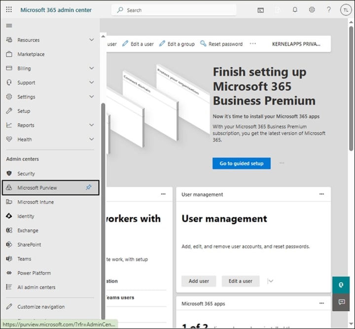 - Go to Microsoft 365 admin center again and launch the Microsoft Purview window.