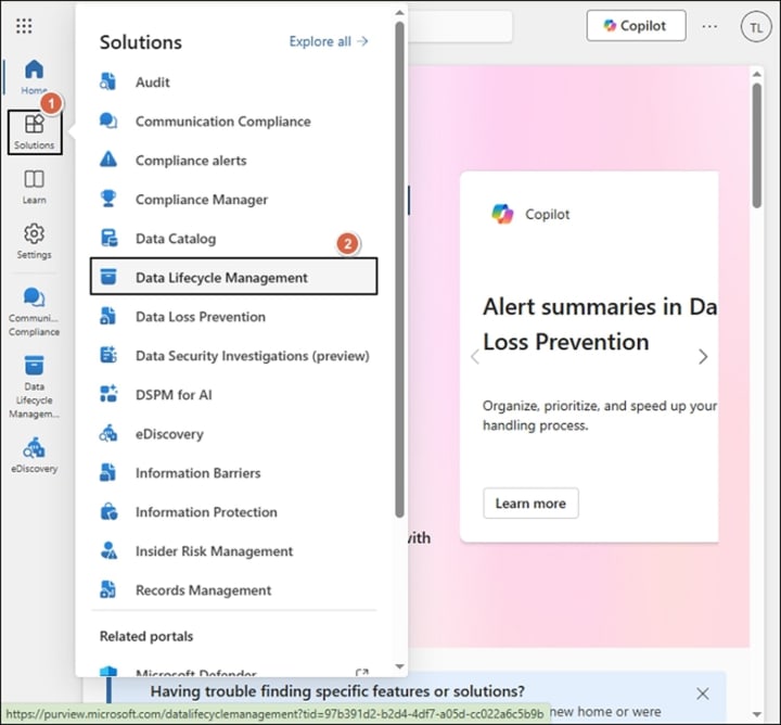 - Then go to the Solutions tab and click on Data Lifecycle Management.