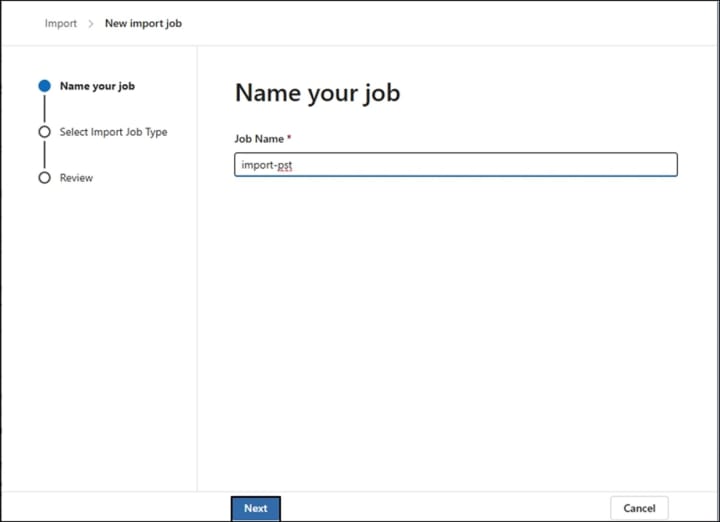 - Name the newly created PST import job and click on Next.