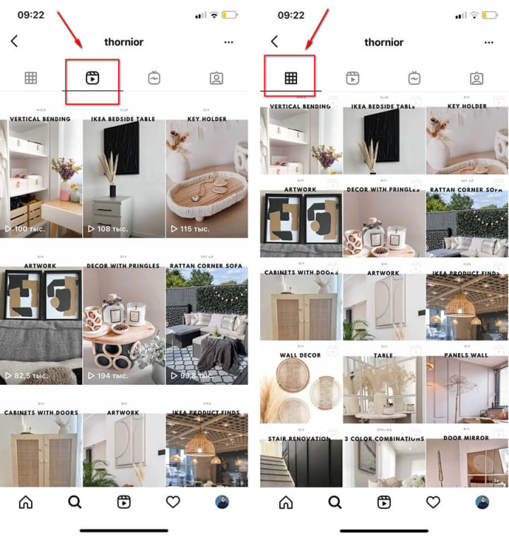 An example of an account with covers - horizontal covers on the left in the Reels tab, and on the right they are the same, but in the profile grid (cropped):