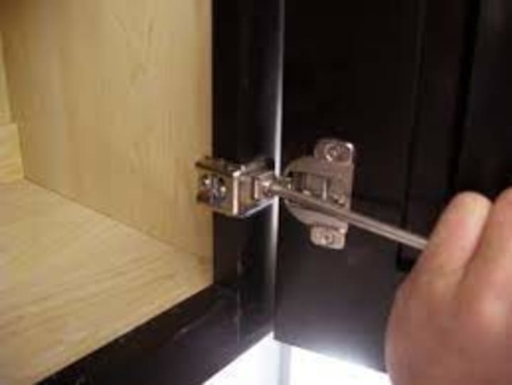 Adjust the doors up and down by moving the mounting plate, and sideways by loosening the adjusting screw on the hinge. The adjusting screws appear as if Phillips head screws but are literally designed to be used with a special Pozi screwdriver. Pozi screwdrivers are available where hinges are sold. Install and adjust the doors before installing the drawer fronts. When all the doors and drawers fronts are on and adjusted, return and add the second screw to the hinge mounting plate and tighten all the adjusting screws.