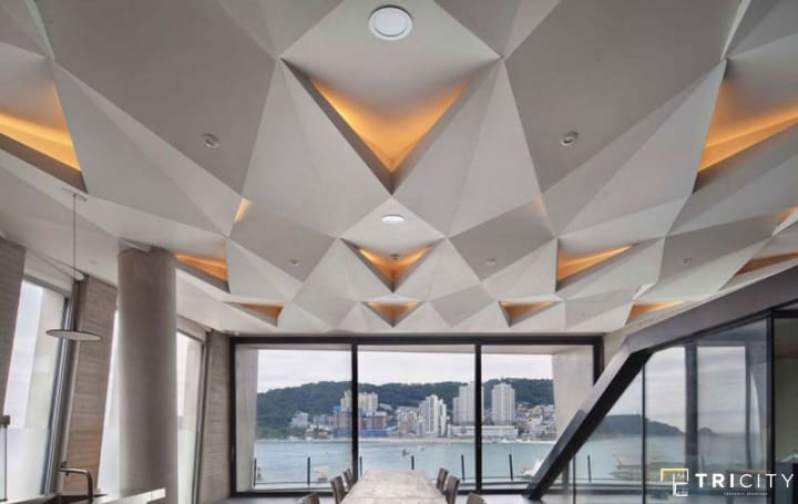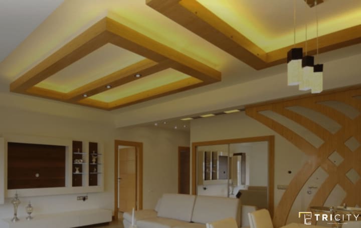 Geometric patterns look elegant. You can opt for false ceiling with protruding squares, rectangles, or triangles. In addition, there are several multi-edged geometric patterns that you can consider.