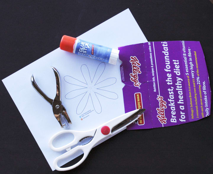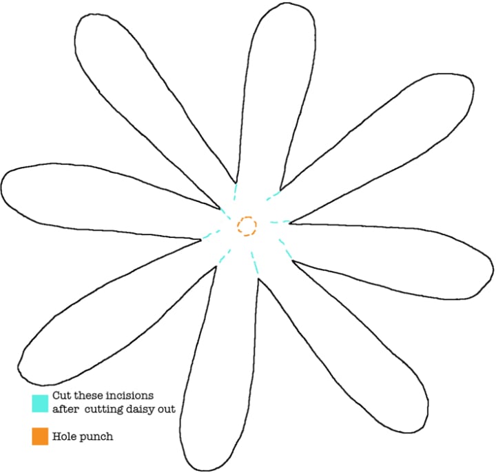 Screen capture, size correctly and print out the pattern. Stick your paper pattern onto the cardboard using the glue stick. Cut out the pattern. Remember to punch a hole in the centre of the daisy pattern where indicated.