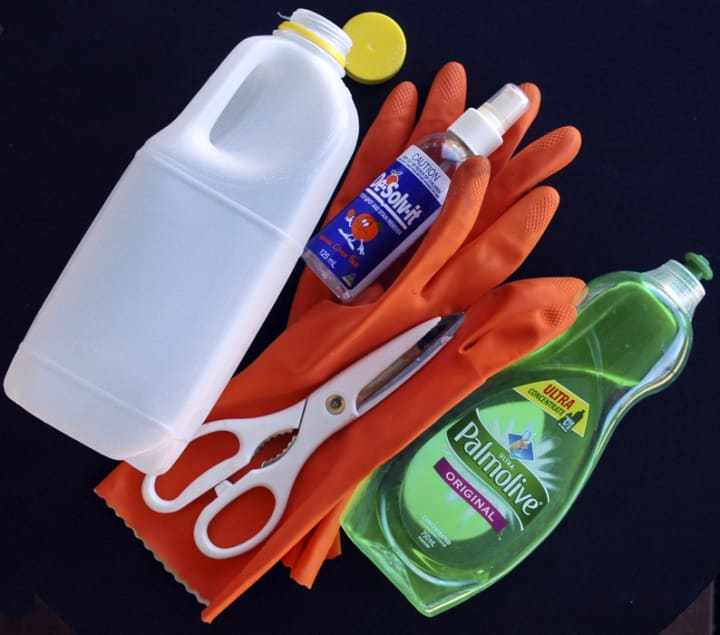 Firstly wash the milk bottle out thoroughly using detergent. Fill the milk bottle with very hot water and wait a few moments. The heat from the hot water will allow you to peel off the labels. Remove the labels and discard. Tip out the water and spray de-solv-it onto the remaining sticky residue. Use your gloves to rub the de-solv-it over the sticky areas. Use a little detergent to dissolve everything and rinse clean. You can also choose milk bottles with a light plastic sleeve which is more easily removable and does not leave a sticky residue.