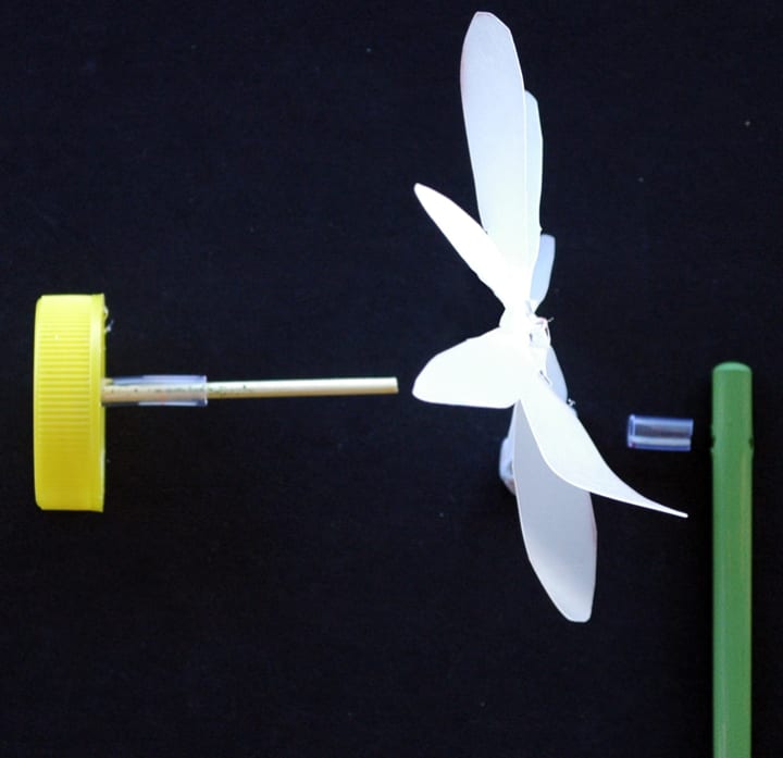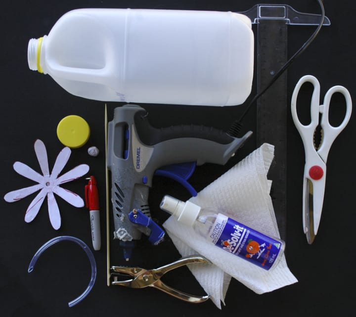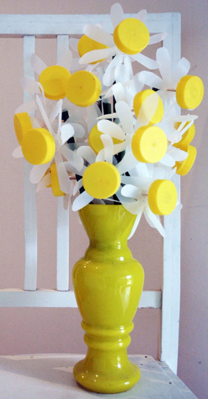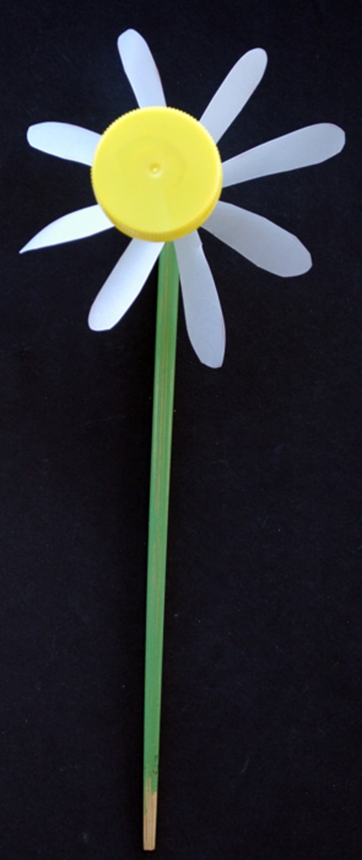 Written instructions including photos follow below. The daisy petals are fashioned from milk bottle plastic and incorporate the lid, they are a kinetic creation and catch the wind with their angled petals, in the same fashion as the blades of a windmill.
