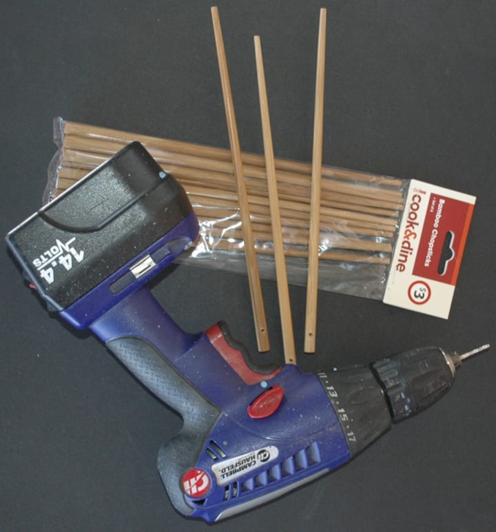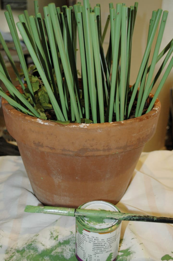 Drill a hole through the chopstick with the electric drill using a 3” (2.38mm) size drill bit. Wiggle the drill bit around a tad to make the hole just a little larger. Sandpaper to remove any jagged edges if you wish. Paint the chopstick green, the bottom tip doesn’t need paint as it will eventually not be seen when the daisy is “planted” in the soil. I let the stem dry by placing it in a pot of soil. You can see I made a batch of around 60 stems all at once. Let the paint dry while you work on the flower component of the daisy.