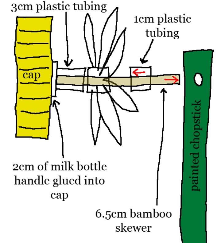 Cut a 1cm length of the plastic handle (use the ruler and the Sharpie pen). Apply a generous amount of hot glue to the centre of the inside of the yellow lid and place the 1cm length of milk bottle handle in the centre. Fill the void in the handle with glue and insert the 6.5cm piece of bamboo skewer. Slip a 3cm length of clear plastic tubing over the bamboo skewer and push down to the base of the skewer. Hold the skewer vertically until the glue has cooled sufficiently for the skewer to remain vertical of it’s own accord and place this component in the freezer to speed up the glue cooling process.