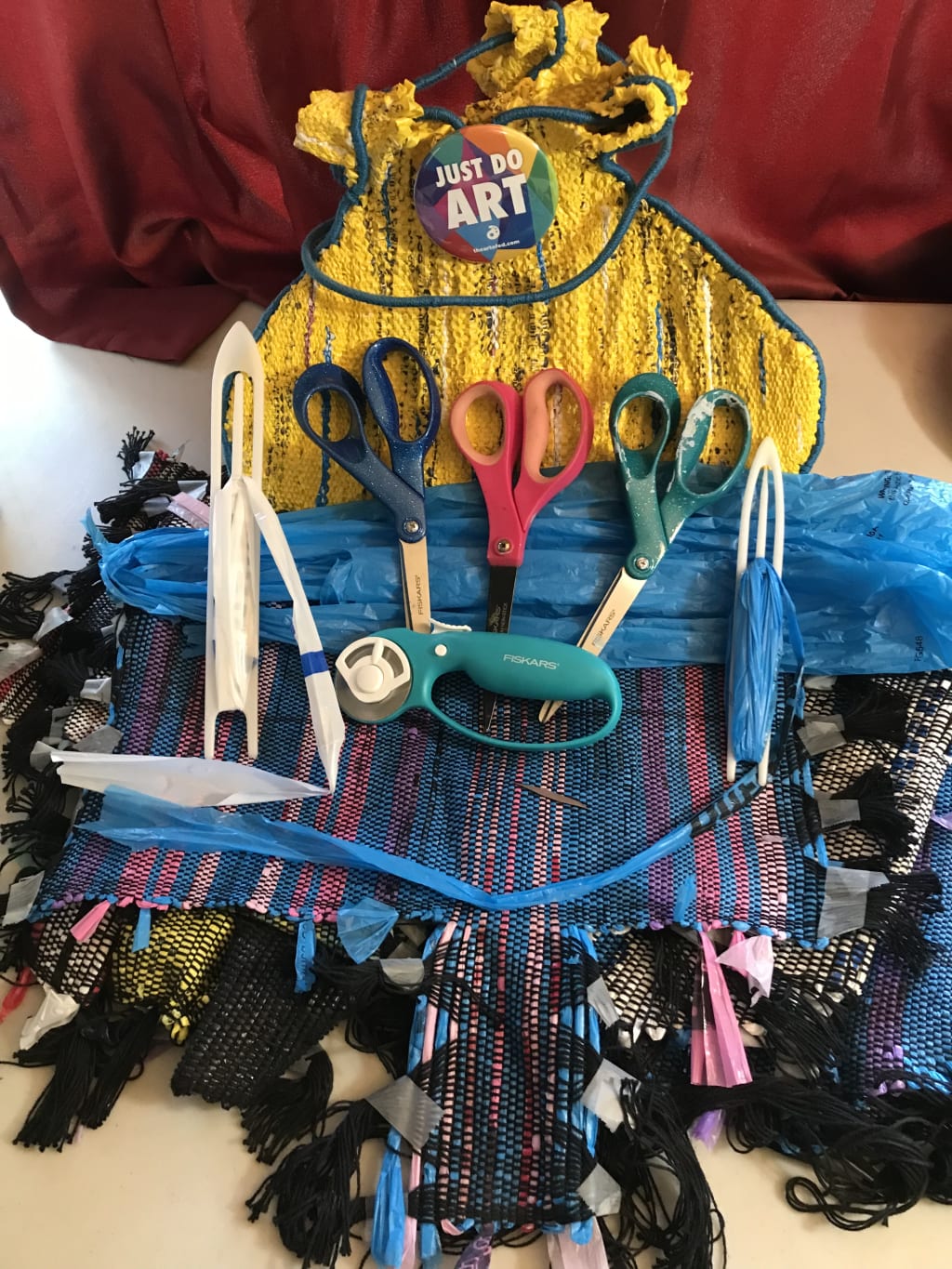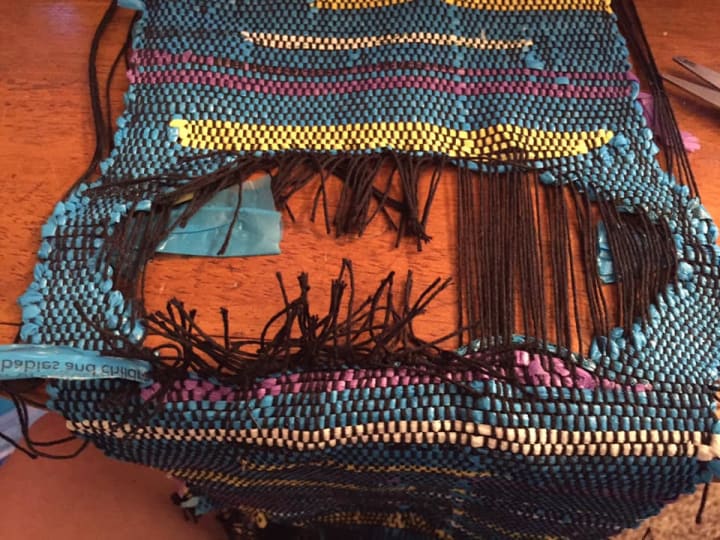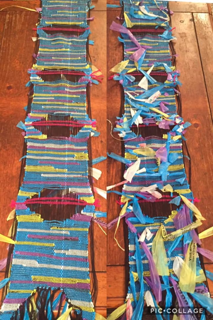 These piece are now off the loom and ready to be constructed into new functional fashionable art pieces that also keep plastic bags from ending up in landfills or waterways.