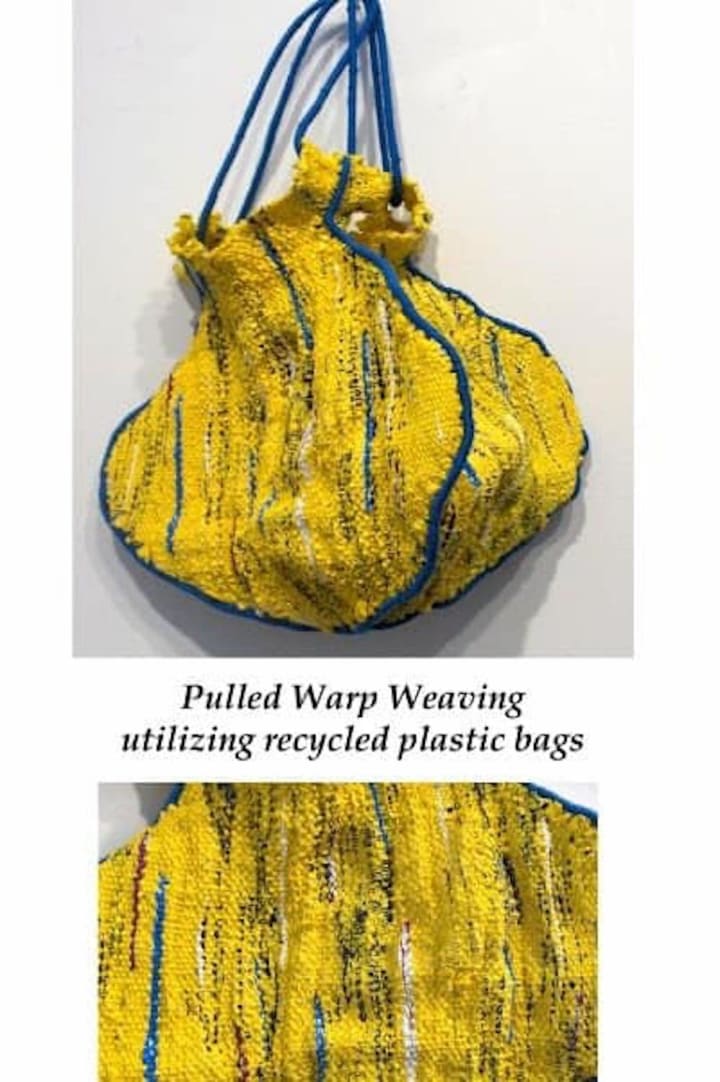 Even after teaching for 15 years, I am always looking for new ways to make Art with unexpected materials, usually for an art lesson for my middle school students. This passion was set in motion in the mid 2000's when I was a Graduate Teaching Assistant at Kent State University. A graduate level 3 Dimensional weaving course perpetually pushed us to consider making woven textiles out of wire, natural fibers, paper and "Plarn". Plarn, Plastic yarn, is created by cutting a continuous spiral into an ordinary grocery bag.
