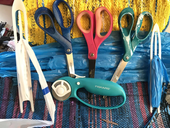 Making Piles of Plarn takes a super sharp pair of scissors and awesome friends who collect and mail uniquely colored bags to me in Ohio from Maryland to Arizona. My middle school students also know they can use any of the tools in my room safely but the ones with the Glitter handles are Miss B's and the rotary cutter is known as "the No-No" tool because the one at school has the word "no" sharpied all over it for safety purposes lol