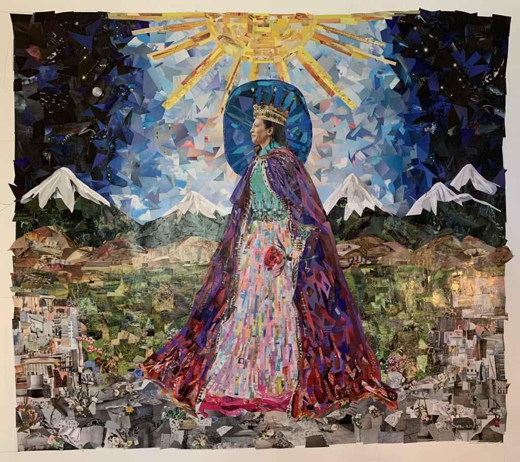 In the last year I have expanded my "magazine makeover" process. I started making extra large collages by using something off of every page of an entire years magazine subscription. For my first embarkment into the full-year-worth-of-pages collage, I went with the iconic Vogue magazine. 12 gleaming issues, filled with countless ads and swoon worthy fashion editorials. This piece quickly became my largest collage to date- a 5 x 6 foot collage using 1928 pages of the entire 2020 Vogue subscription. Made to commorate Kamala Harris's triumphant election, she proved to be the ultimate muse for this piece. Stoic and regal in a her crown and cape, I placed her in a luminous spring field, framed by snowy mountainous peaks. The collage itself has a painterly feeling; I enjoyed blending colors using thousands of snippets of magazine pages. I was proud to honor our first female Vice President elect via my art and I feel my piece captured the magnitude of that historical moment.