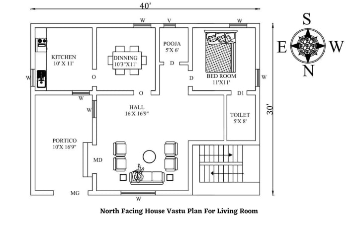 Vastu shastra guidelines suggest two directions for the living room. You can build your living room in the northeast direction in your North facing house Vastu plan. Northwest corner is also an ideal direction for the living room.