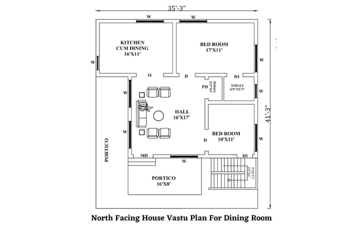 Vastu Shastra suggests that the dining room must face east, west, or north. A person sitting at the dining table must face any of these directions while eating their meals. You can choose the west direction for building your dining room in north facing house Vastu plan.