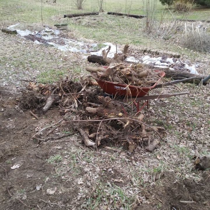 First things first were clearing out the trees. I had some friends and my brother help take away the limbs. I wasn't sure how best to go about moving the raspberries and let them grow until the next season. Before I would move them however, I would spend my free time looking for the roots.