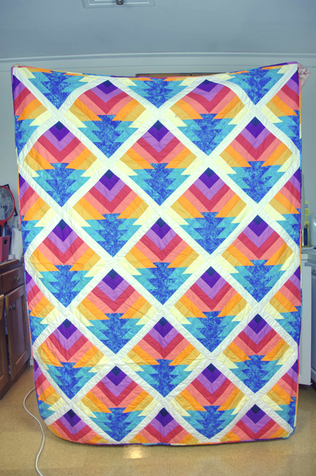 This freedom to choose any variation of the required materials contrasts with the precise nature of quilting, and how meticulous quilters have to be in order to create even a passable looking quilt. A lot of things have to be done exactly right to make a quilt pleasing to the eye, from making sure the fabric colours will go together in the context of the quilt at the beginning of the process, to choosing the right binding method at the end. This fusion of infinite potential and rather strict practice is what drew me to quilting, I was curious to see how people could create these wonderful things in a medium that has so many restrictions, compared to other mediums like painting or drawing. Having worked with other mediums, I can say that it is easier to get a more realistic image from paint or pencil, but quilting is ideal for creating big, colourful and unique compositions.