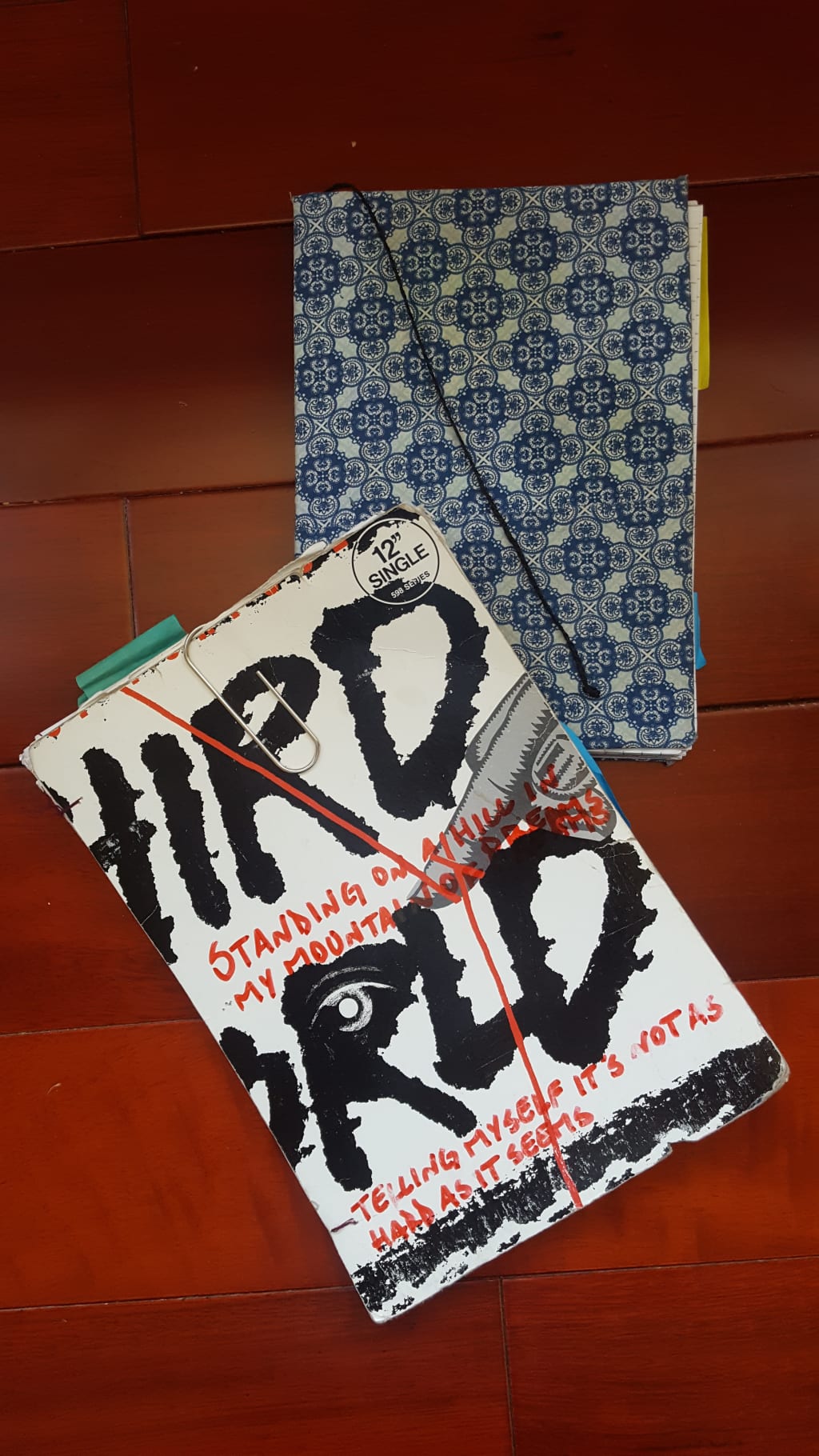 Right then, sitting on my bedroom floor, wearing Halloween pajamas, holding a record I didn’t like on one hand and a an almost filled notebook on the other, the idea hit me. I ran to my drawer and pulled out all of my notebooks. I pulled each blank page out of different colored spirals and placed them on the ground. By the time the last page landed atop the pile, there was enough paper for one notebook.