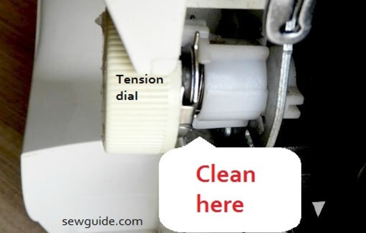 You can clean in between the tension discs with a thin sheet of paper. You can blow air with an air compressor to get whatever is caught in between.